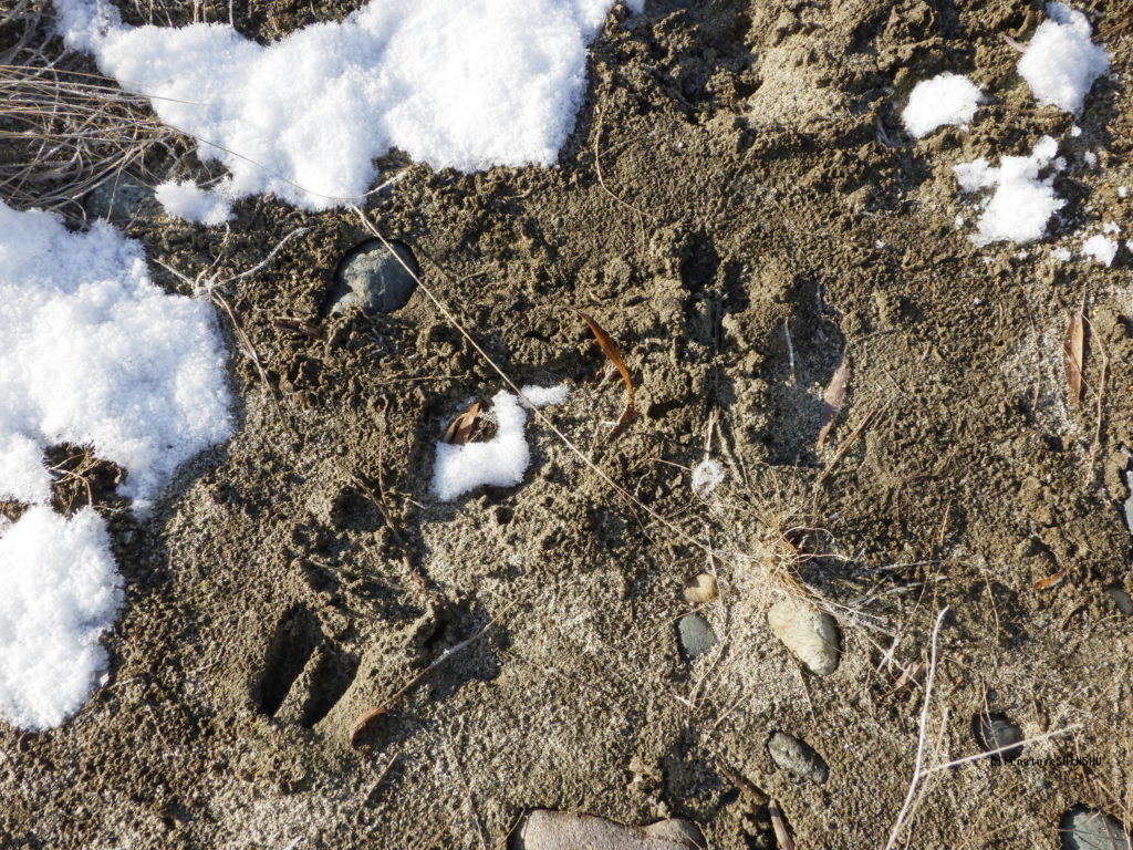 散歩コースの河原には、昨日の朝に少しばかり降った雪がまだら状に残っていました。雪の上には小動物や鳥の足跡がありました。そして雪のないところには、別の大きめでシカの足跡ととても似ている足跡です。イノシシです。重たいので雪の上は歩きづらい?それとも冷たいのは嫌いなのでしょうか^^;