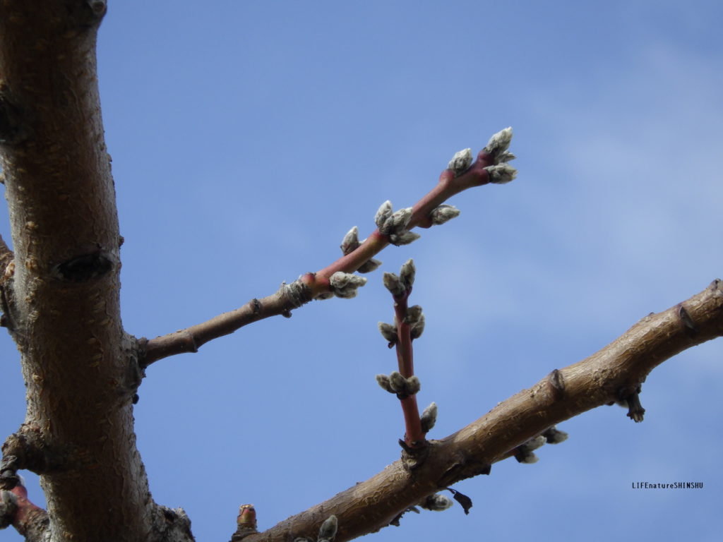 桃の芽は元気です。枝は青空へ向かって伸び、彼らにとっての本当の春を掴もうとしているようです。